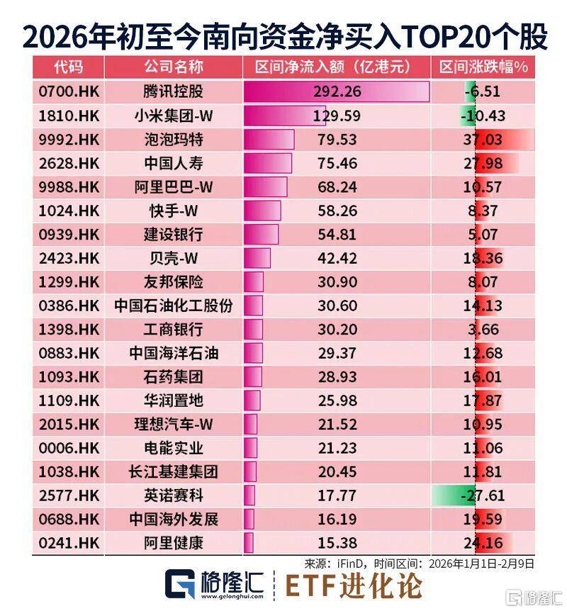 截至2月9日(ri),南向(xiang)资金本年大手(shou)笔买入腾(teng)讯、小米和泡泡玛特,阿里巴巴也净买入68亿港元。